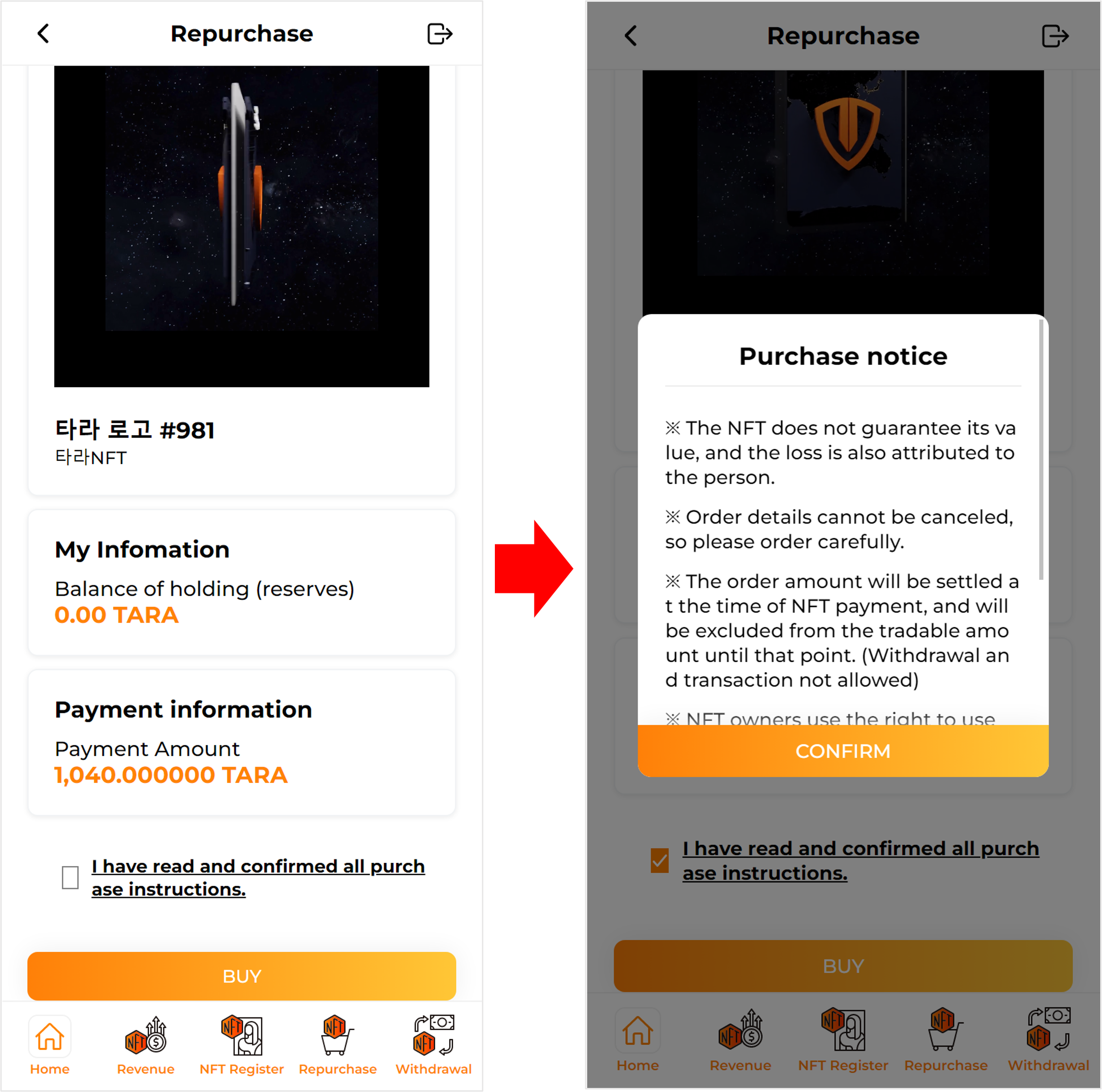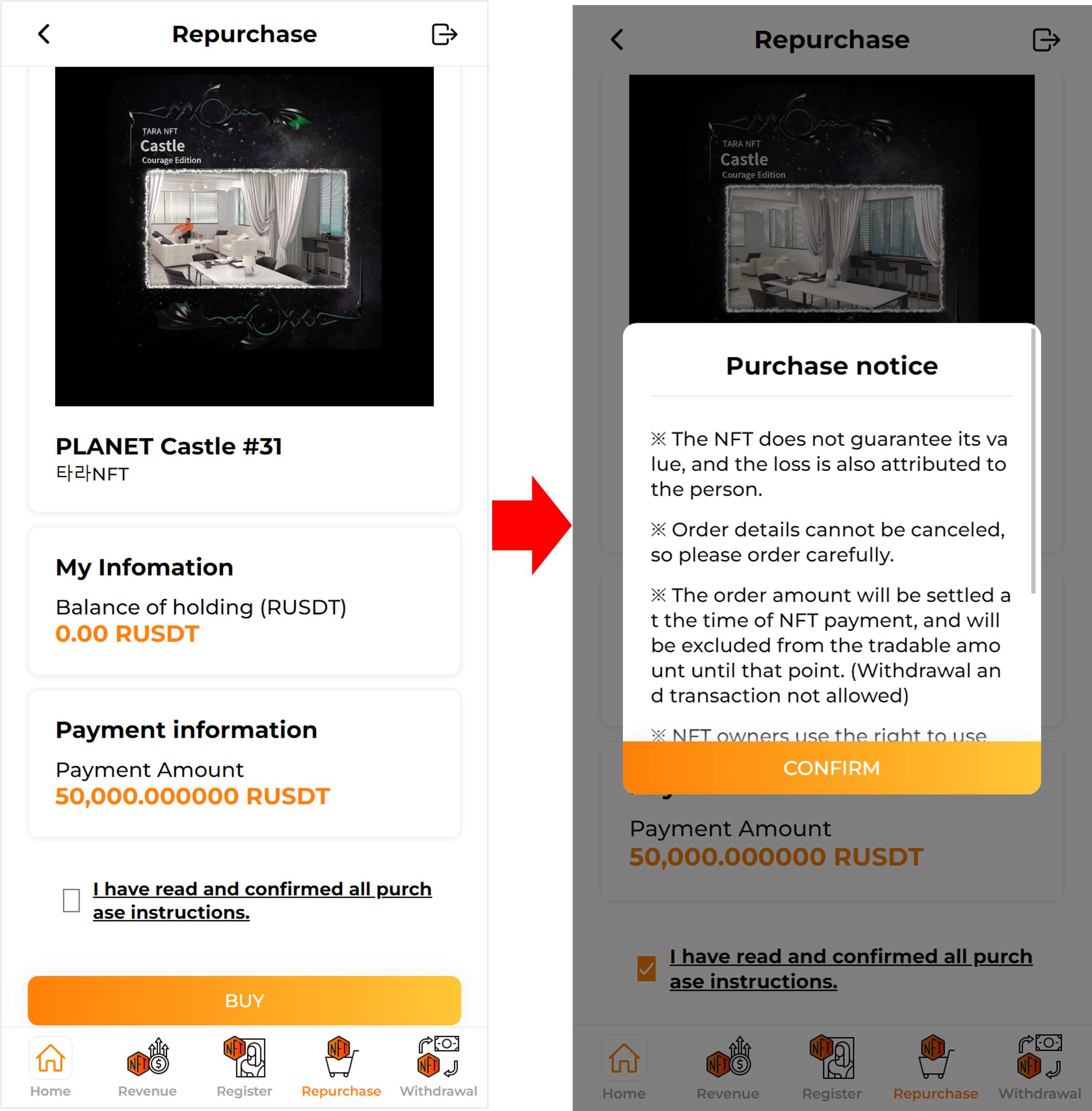 3) You can check the information and balance of the NFT you want to repurchase, You can check the NFT payment amount.