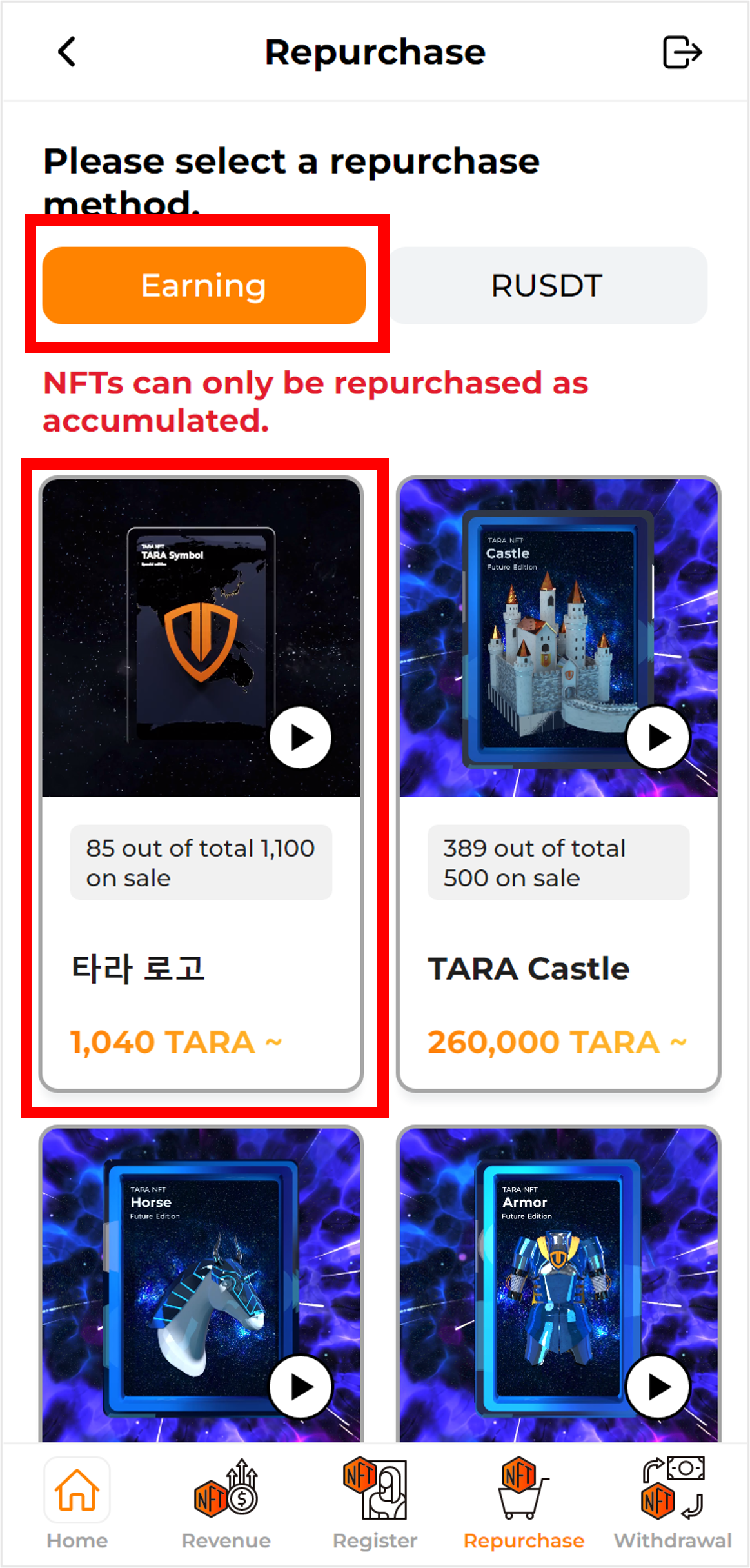 2) After selecting the method to repurchase with Earning, select the NFT to repurchase.