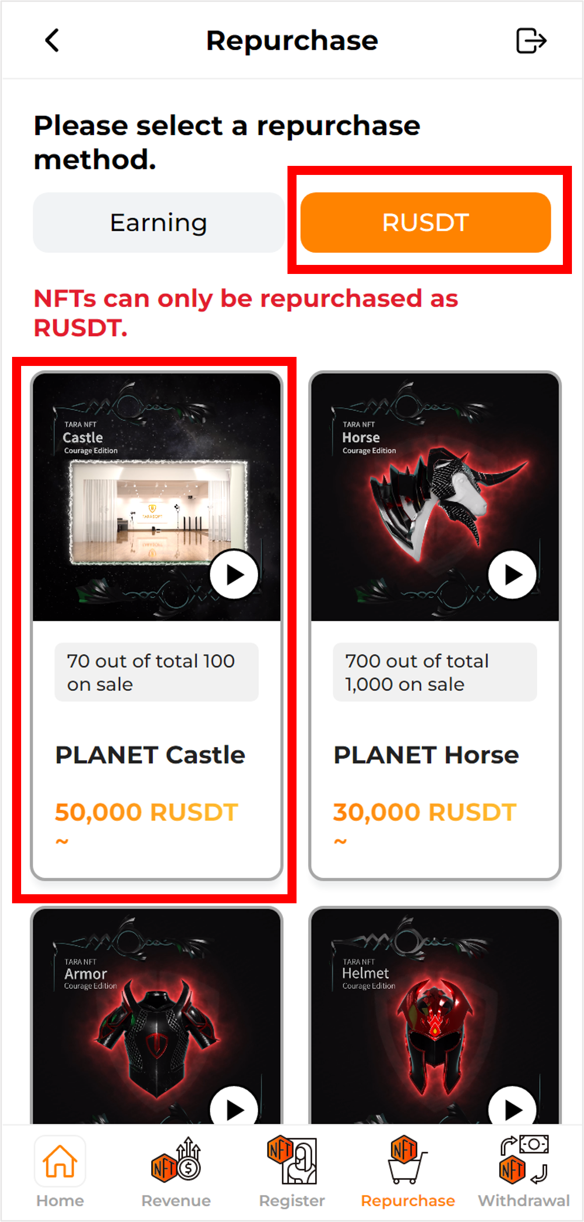 2) After selecting the method to repurchase with RUSDT, select the NFT to repurchase.