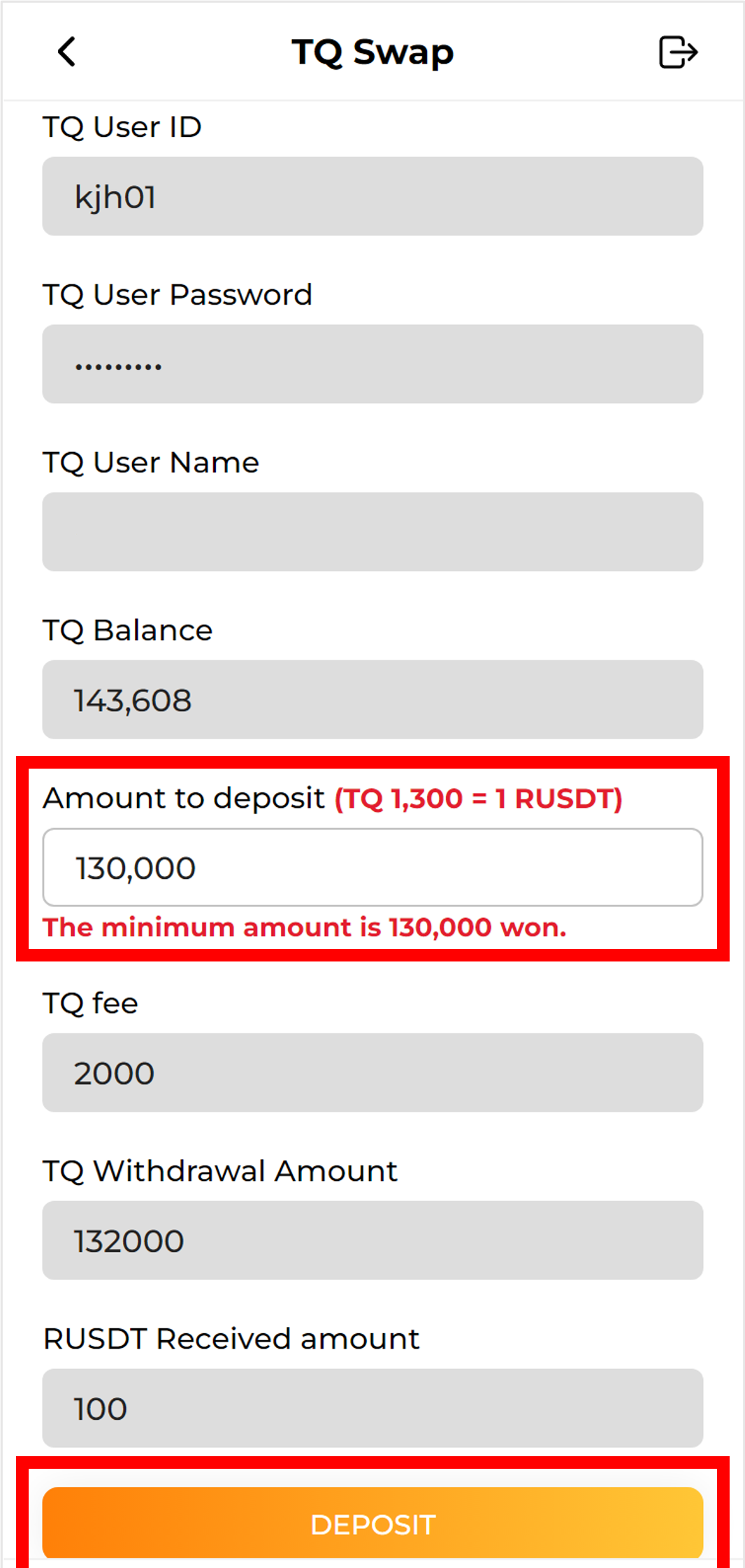 4) After checking your login information and your TQ balance, Enter the amount to deposit.