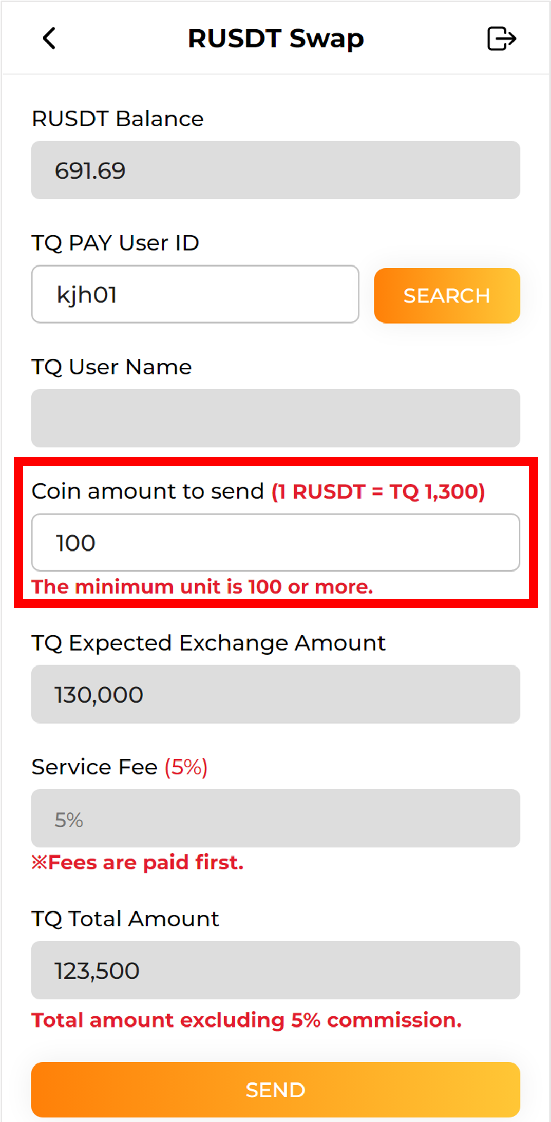 Please click the SEND button after checking the amount you will receive as TQ excluding the commission.
