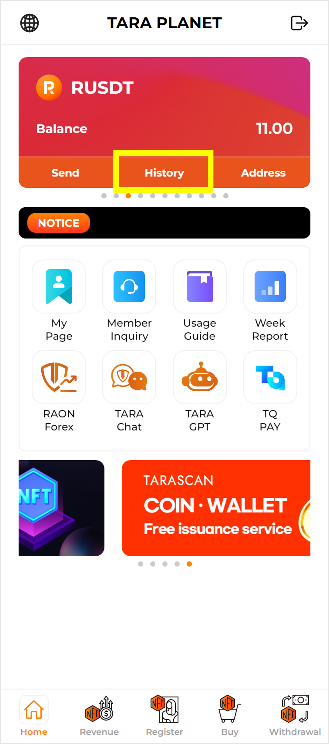Q) Where can I check the history of TQ exchange with RUSDT?