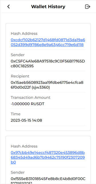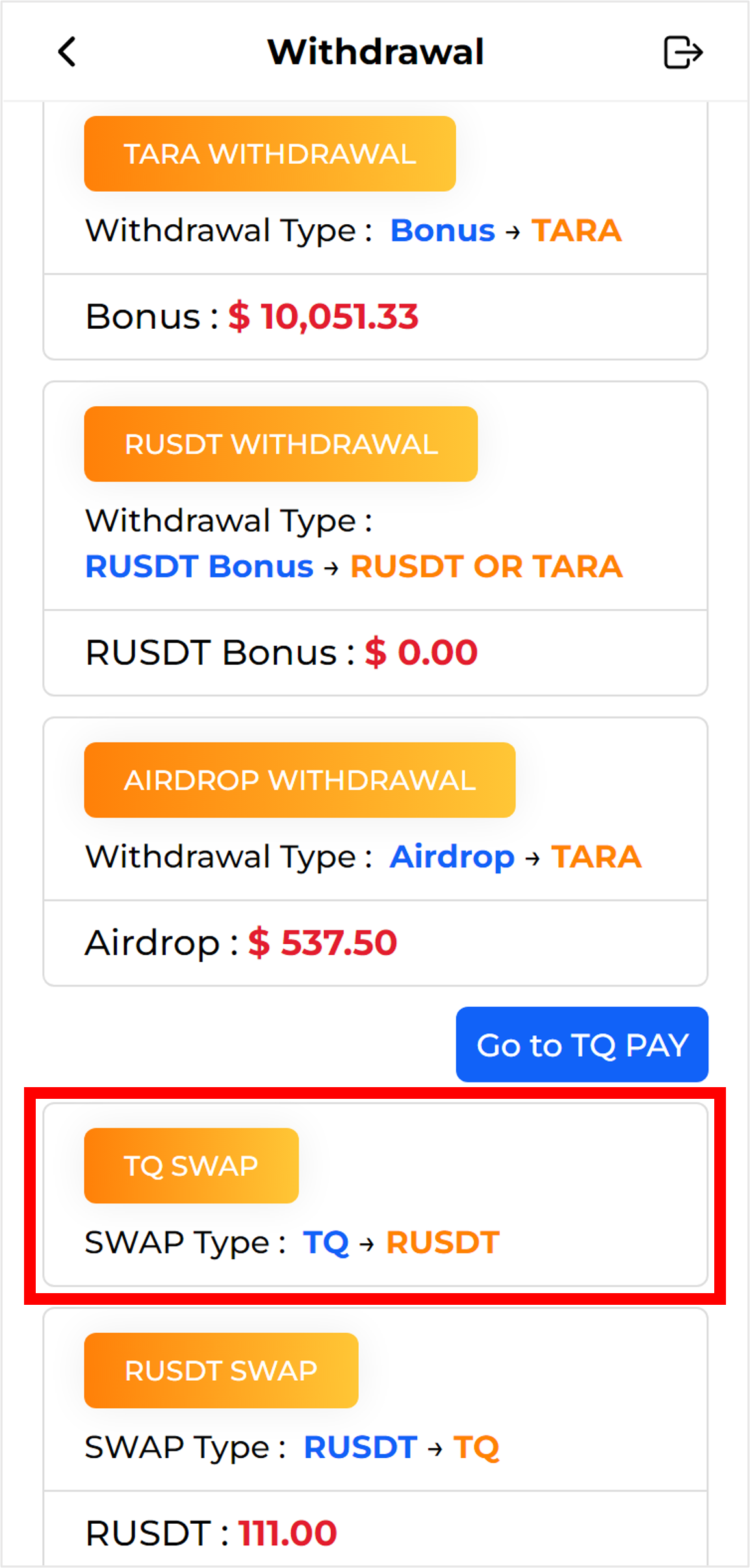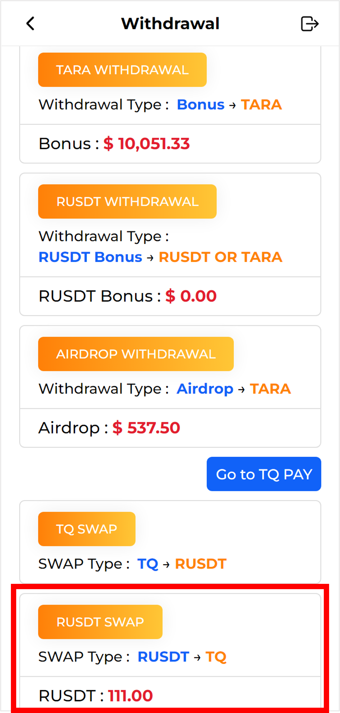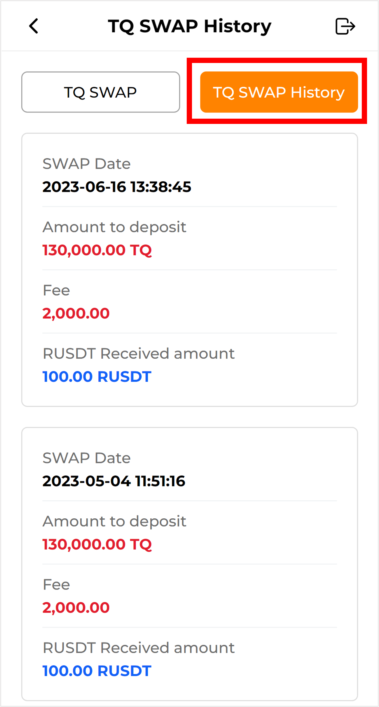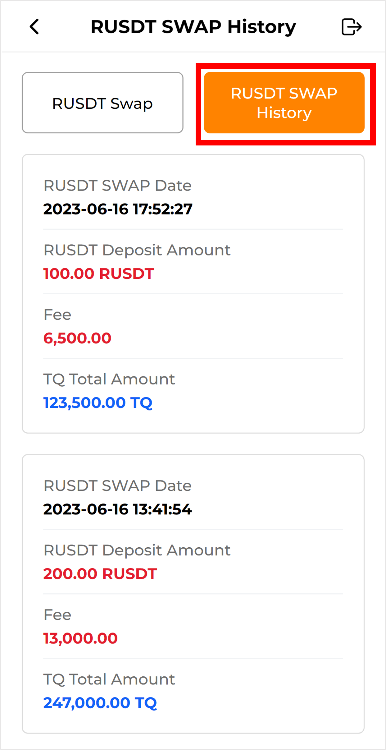 Q) Where can I check the history of RUSDT exchange with TQ?