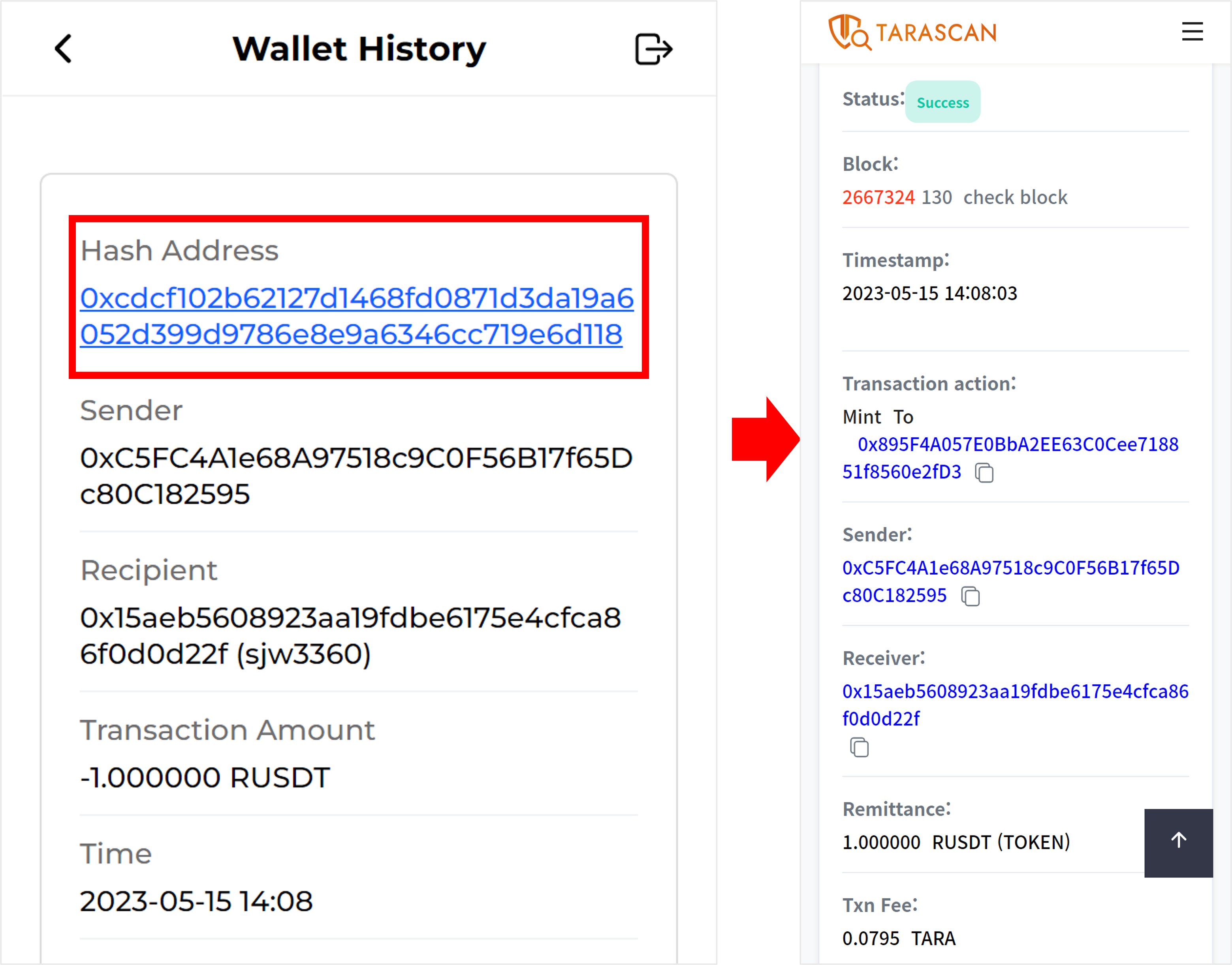3) When you click on a hash address, you can go to tarascan, You can check the details and the transaction status.